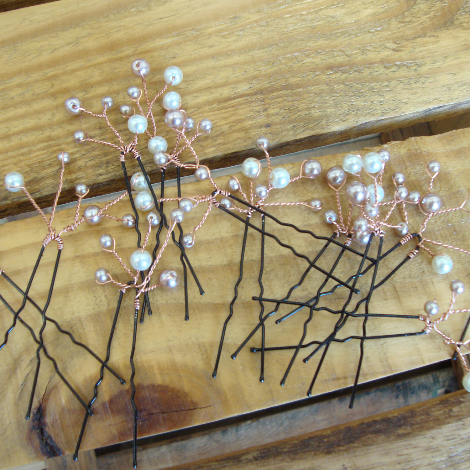 Copper wire and pearls made for fun and special additions for wedding hairdos.